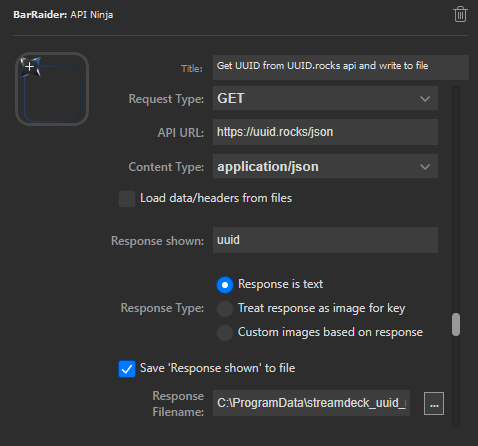 There is an amazing Stream Deck plugin made by BarRaider called API Ninja which lets you make web requests. In this case, we’ll have it request the uuid.rocks JSON API and write the UUID to a .txt file.